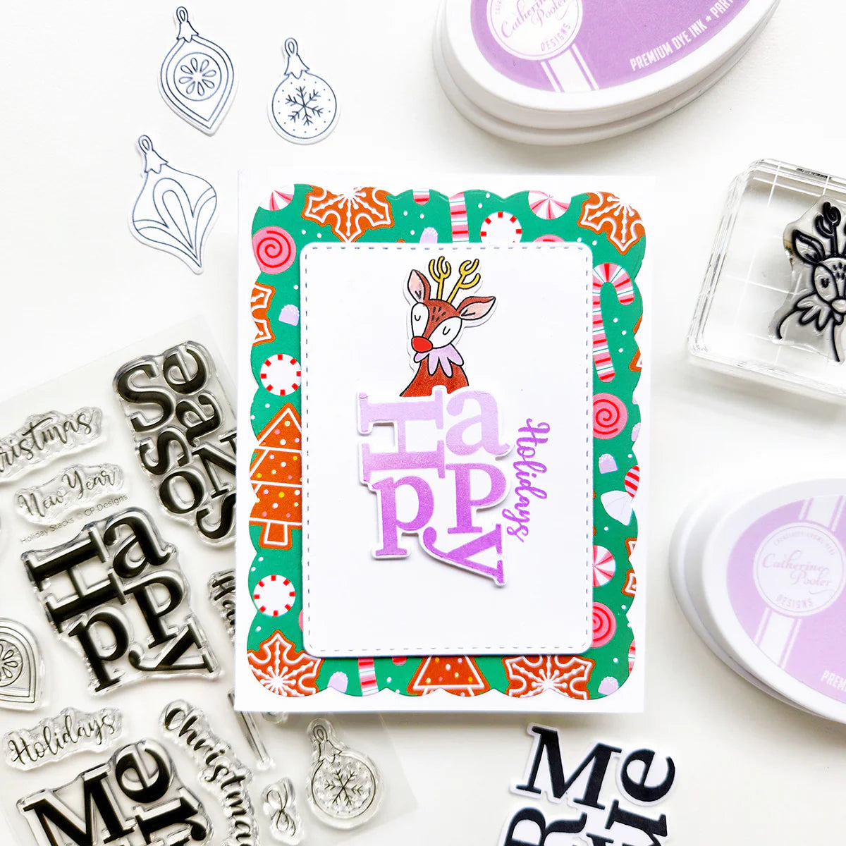 Catherine Pooler - Sentiments Stamp & Die Set - Holiday Stacks. Send a joyful jumble of “merry” and “happy” this season with the Holiday Stacks Sentiment Set. This set features bold, stacked main words paired with secondary scripted sentiments that can nest alongside or beneath the stamped stack, perfect for phrases like “Happy Hanukkah” or “Season’s Greetings.” To complete your cards and scrapbook pages, we’ve also included charming line-art retro ornament stamps.