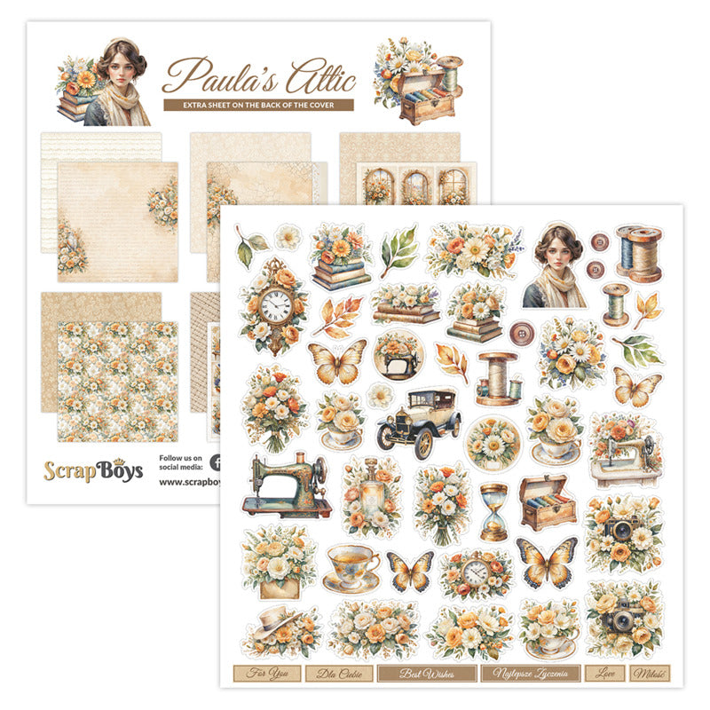 ScrapBoys - 12X12 Paper Pad - Paula's Attic. Scrapbooking paper set - 30,5x30,5 cm - 12 sheets with bonus on the back of the cover - 250 gsm.