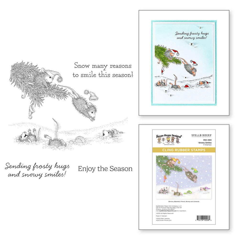 Snowy Smiles Cling Rubber Stamp Set is part of the House-Mouse Tree-mendous Christmas Collection. Monica, Maxwell, Friend, Muzzy and Amanda are having SNOW MUCH FUN using a branch to dive into the snowbanks. In addition to the focal point image, the set of four stamps includes three sentiments: Sending Frosty Hugs and Snowy Smiles!, Snow Many Reasons to Smile This Season!, and Enjoy the Season! Designed to be used with a stamp acrylic block. The House-Mouse Designs® is created and copyrighted by the talented Ellen Jareckie. It is a wonderful collaboration with Spellbinders, and we are excited to share a warm and cozy holiday series of designs with the Tree-mendous Christmas Collection!
